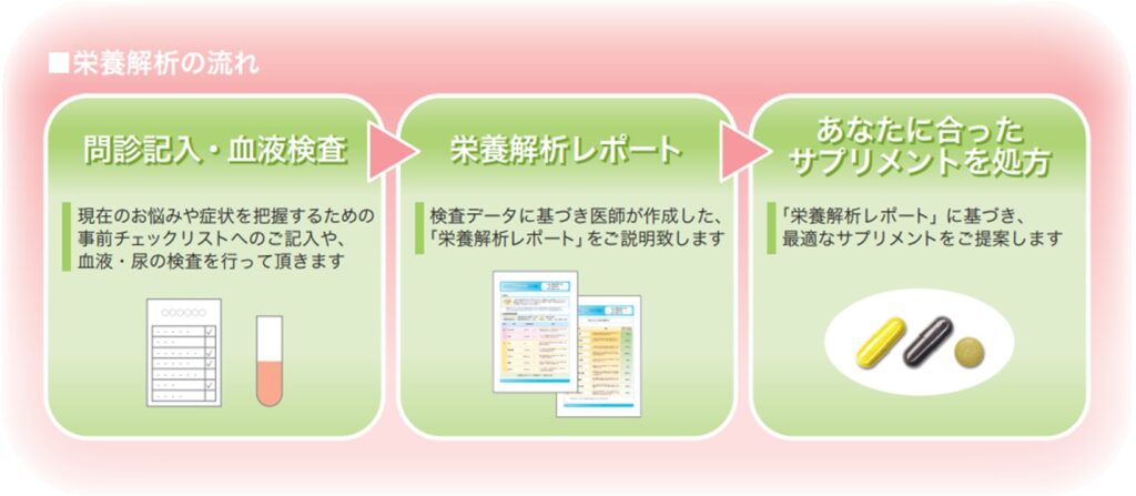 血液検査データをオーソモレキュラー栄養医学的に「栄養解析」することで「不足する栄養素」を見つけ出し、結果を「栄養解析レポート」として患者様にお渡ししています。また必要な栄養素を分析し、お勧めする「サプリメントレポート」も作成し、お渡しします。