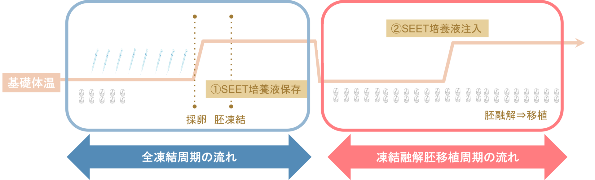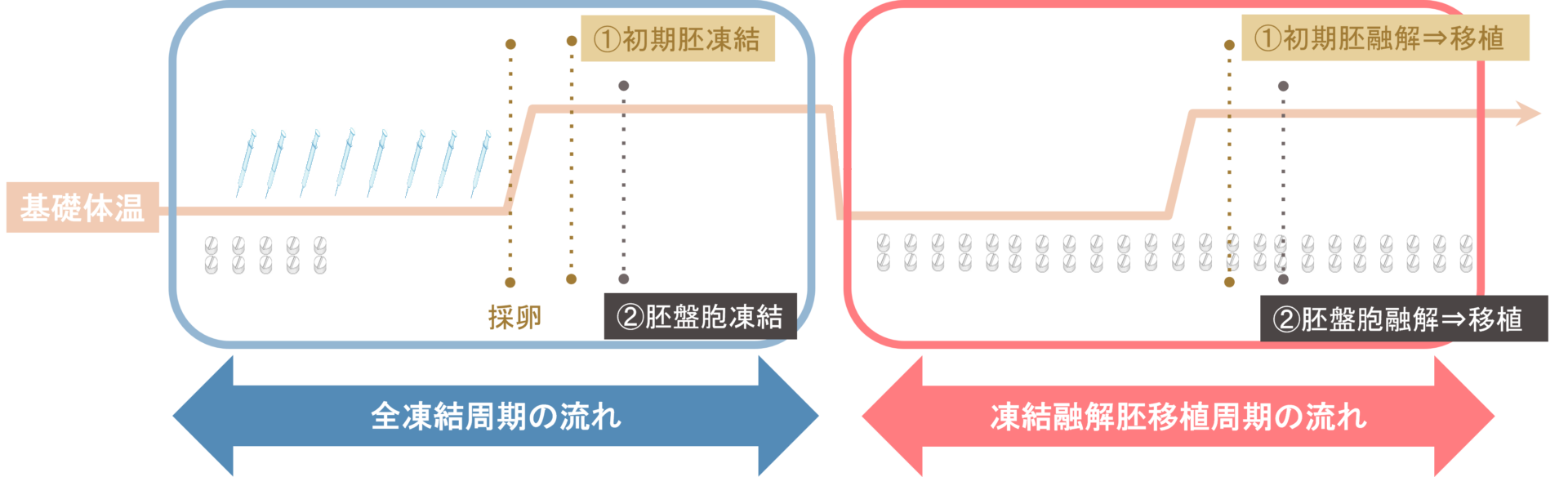 その後の凍結融解胚移植周期で、初期胚移植を行い、その2~3日後に胚盤胞移植を行います。