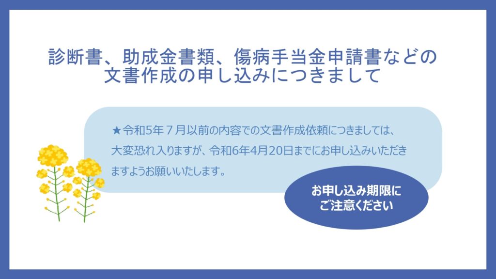 令和5年7月以前の内容での文書作成依頼につきましては、令和6年4月20日までにお申し込みいただきますようお願いいたします。